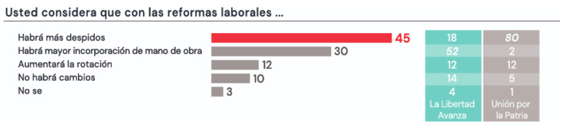 Inclusive, 63% de los encuestados observa que supropia situación económica está peor, respuesta que ofrece el 45% de electores libertarios y el 87% de quienes votaron a Unión por la Patria (UxP) en 2023. Y ni siquiera la reforma laboral despierta gran entusiasmo hacia futuro, porque si bien 80% de los votantes de UxP cree que habrá más despidos, también lo piensa 18% de los oficialistas. Solo 30% del total cree que habrá mayor incorporación de mano de obra.