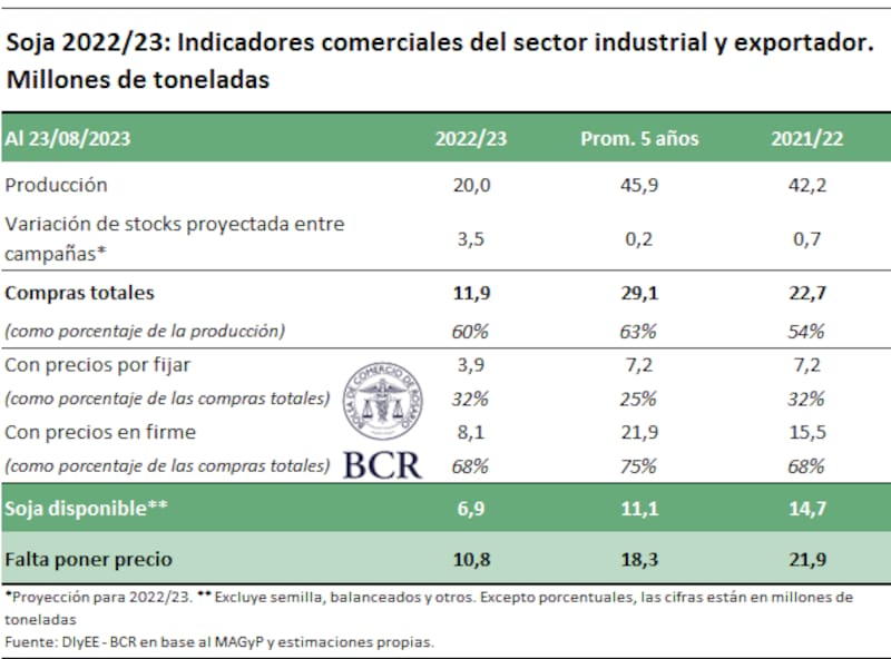 Según la BCR, quedarían por comercializar poco menos de 7 millones de toneladas de soja 2022/23. "Si sumamos el volumen de mercadería comercializada con precio por fijar, restaría ponerles precio a casi 11 millones de toneladas de soja. Asimismo, hay comercializadas 0,8 Mt de soja 2023/24, pero poco más de 0,1 Mt tienen precio en firme", informó.