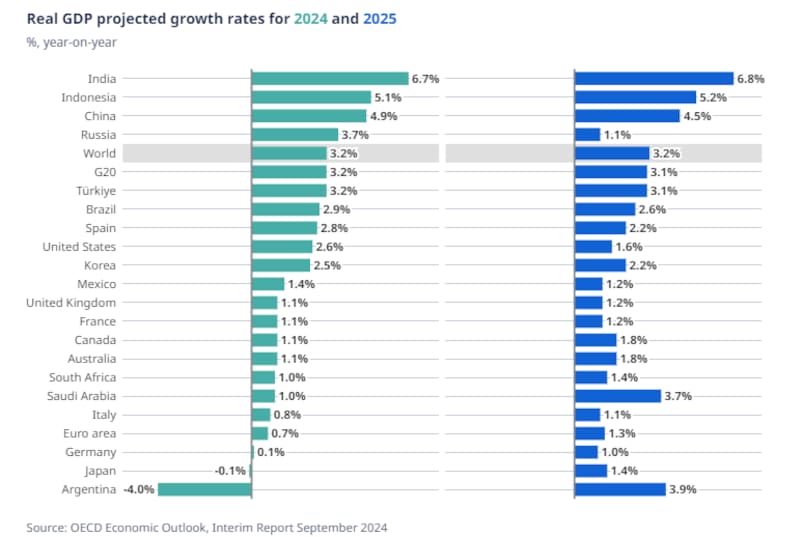 En ese marco, la proyección para 2025 de crecimiento para Argentina según la OCDE mejoró 1,2 puntos. A nivel mundial, la OCDE espera un crecimiento de 3,2% del PBI tanto este año como el próximo, una estimación en línea con la de mayo pasado.