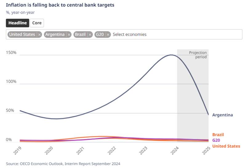 Para el año que viene, en tanto, la OCDE prevé que la Argentina rebotará 3,9%, con lo que recuperaría casi la totalidad de lo perdido este año. La meta del Gobierno es más ambiciosa para 2025, que proyecta un PBI que avanzará 5%.