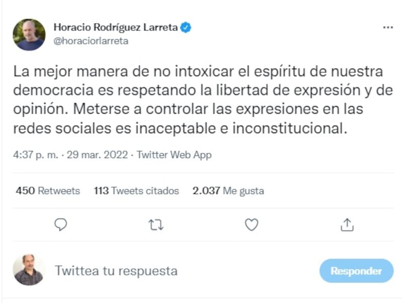 "La mejor manera de no intoxicar el espíritu de nuestra democracia es respetando la libertad de expresión y de opinión. Meterse a controlar las expresiones en las redes sociales es inaceptable e inconstitucional", opinó el jefe de Gobierno porteño, Horacio Rodríguez Larreta, a través de Twitter.