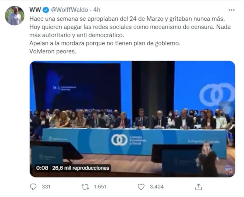 Waldo Wolff, diputado del ala dura del macrismo, advirtió que desde el oficialismo "quieren apagar las redes sociales como mecanismo de censura", al tiempo que consideró que no existe "nada más autoritario y anti democrático". Y agregó: "Apelan a la mordaza porque no tienen plan de gobierno. Volvieron peores".