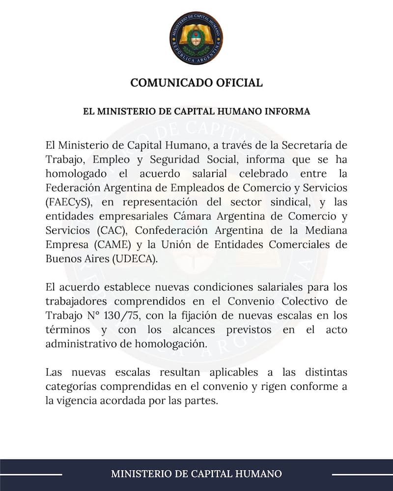 La resolución confirmó el convenio alcanzado entre FAECYS, la Cámara Argentina de Comercio (CAC), la Confederación Argentina de la Mediana Empresa (CAME) y la Unión de Entidades Comerciales (UDECA), luego de semanas en las que se especuló con una posible homologación parcial.