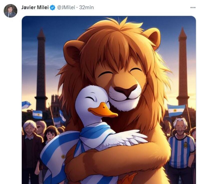 Lo hizo compartiendo únicamente una ilustración de un pato [por Patricia Bullrich, "Pato"] abrazando a un león, animal con el que Milei se identifica.