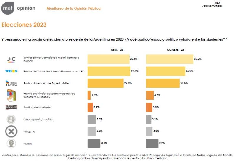 En segundo lugar figura el Frente de Todos, que pasó de 27,3% a 25% en el mismo período. Cerca, aunque también en retroceso, la opción libertaria de Javier Milei: estaba en 22,8% en abril y se encuentra en 21,5%.