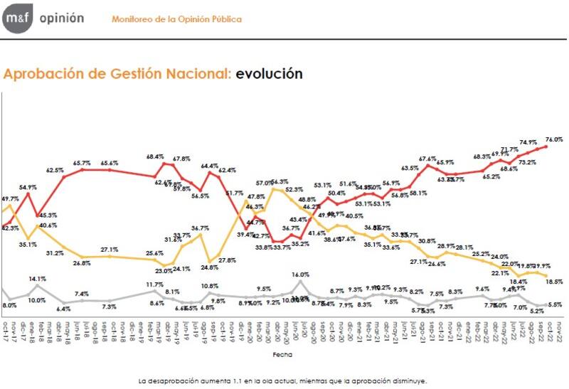 A trece meses de que concluya el mandato, el Gobierno de Alberto Fernández muestra sus peores números históricos en cuanto al nivel de desaprobación. Esta es una de las conclusiones que se extrae de la encuesta de la consultora Management & Fit realizada en todo el país. Además, el estudio contiene datos de imagen de los principales dirigentes del país y hasta un apartado sobre el Mundial de Catar 2022.