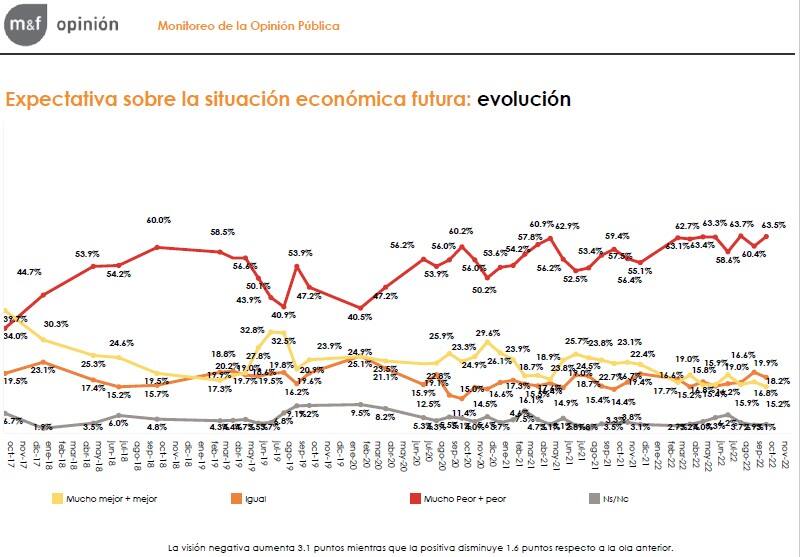Las expectativas económicas no se encuentran en un mejor lugar. En la medición más reciente, el 63% cree que la situación será peor o mucho peor en el futuro. En cambio, solo un 15% considera que será mejor o mucho mejor. En el medio, un 18% está convencido de que la economía estará igual en el futuro.