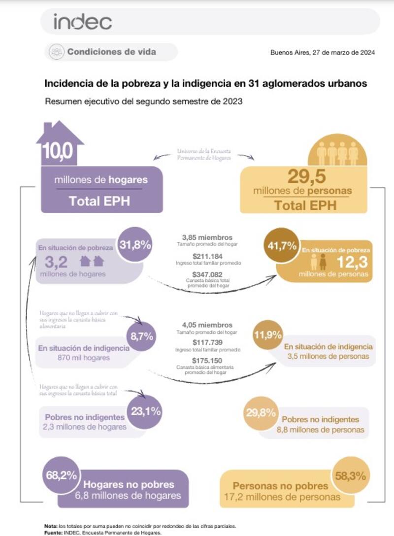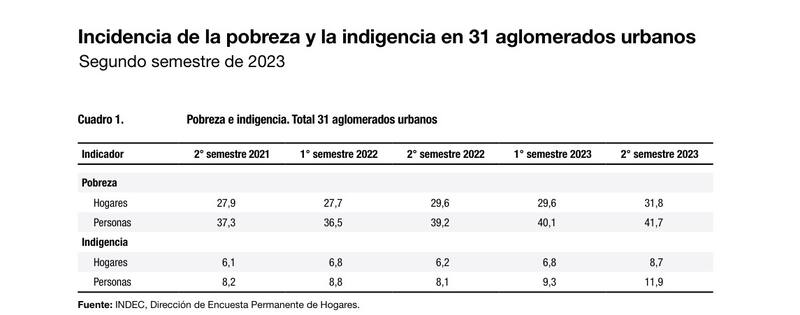 Según el INDEC, el 31,8% de los hogares se encuentran bajo la línea de pobreza (LP), lo que representa un aumento de 2,2 puntos porcentuales (p.p.) con respecto al primer semestre. Eso significa que 41,7% de las personas son pobres, un aumento de 1,6 p.p. en el mismo período. A su vez, 8,7% de los hogares se encuentran bajo la línea de indigencia (LI), lo que representa un aumento de 1,9 p.p. Esto se traduce en que 11,9% de las personas son indigentes, un aumento de 2,6 p.p.