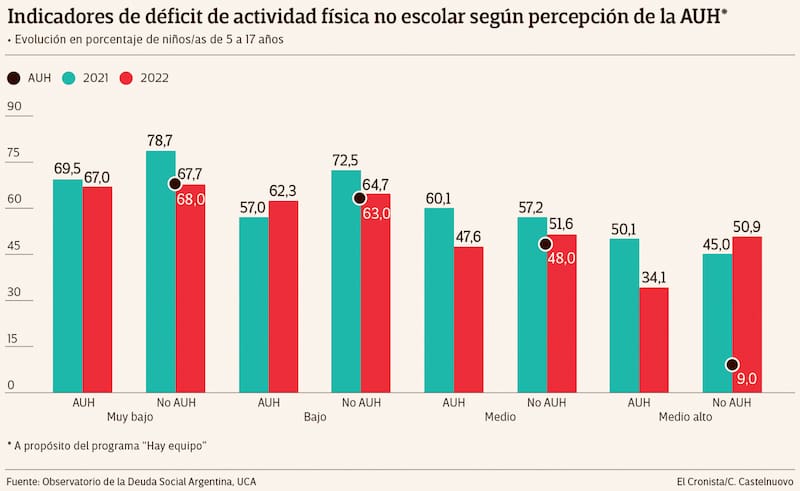 Hay un dato alentador en medio de tantas cifras alarmantes. Entre los niños de entre 5 y 17 años se registra una merma del déficit en la inactividad física (chicos/as que no realizan deportes ni actividad física no escolar), alcanzando en 2022 al 53,3%.