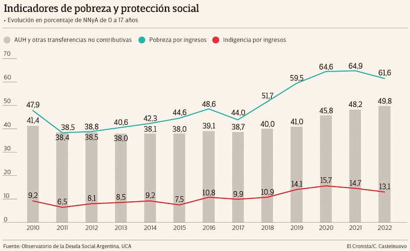 Allí se revela otro dato sobresaliente: en el último año hubo un incremento sustancial de la ayuda social en términos de programas como la Tarjeta Alimentar, la AUH o los comedores escolares (fue del 48,2% en 2021 al 49,8% en el 2022) pero con todo eso la pobreza en los menores no ha bajado. Por el contrario, se evidencias casos extremos de pobreza infantil en el Gran Buenos Aires del 57,4%, en el NEA del país del 57,1%, en Cuyo del 53,4% y en el NOA del 54%.