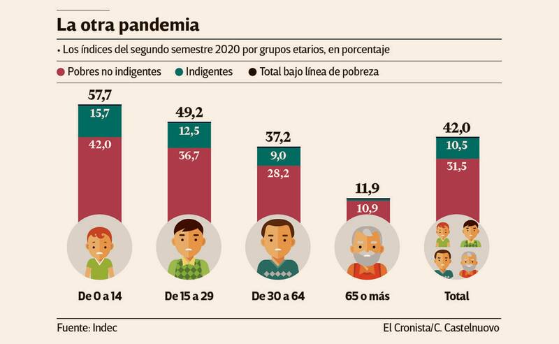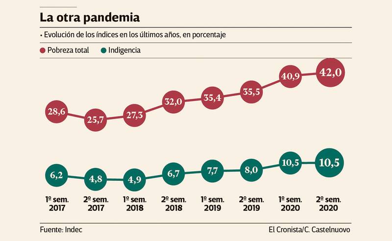 Por la crisis económica y social provocada por la pandemia, la aceleración de la inflación -en particular del precio de los alimentos-, mayor desempleo y una abrupta recesión que lleva tres años en el país, la pobreza alcanzó al 42% de los argentinos, de acuerdo al número del segundo semestre de 2020 que publicó el Indec.