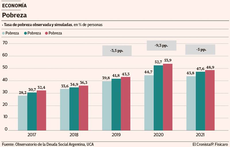 Esto es: en la proyección que hizo el informe de la UCA revela que en el 2021 si no se hubiesen mantenido los planes sociales o transferencias monetarias como la AUH o la Tarjeta Alimentar el nivel de pobreza estaría en el orden del 48,9%. Son los denominados "efectos corrosivos" de la pobreza y el impacto que tiene en ello la política social.