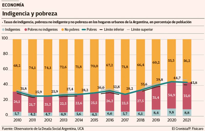 En relación a las mediciones de pobreza por nivel de ingreso el informe del Observatorio de la Deuda Social plantea que en 2021 hubo una disminución respecto del 2020 (44,7% al 43,8%).