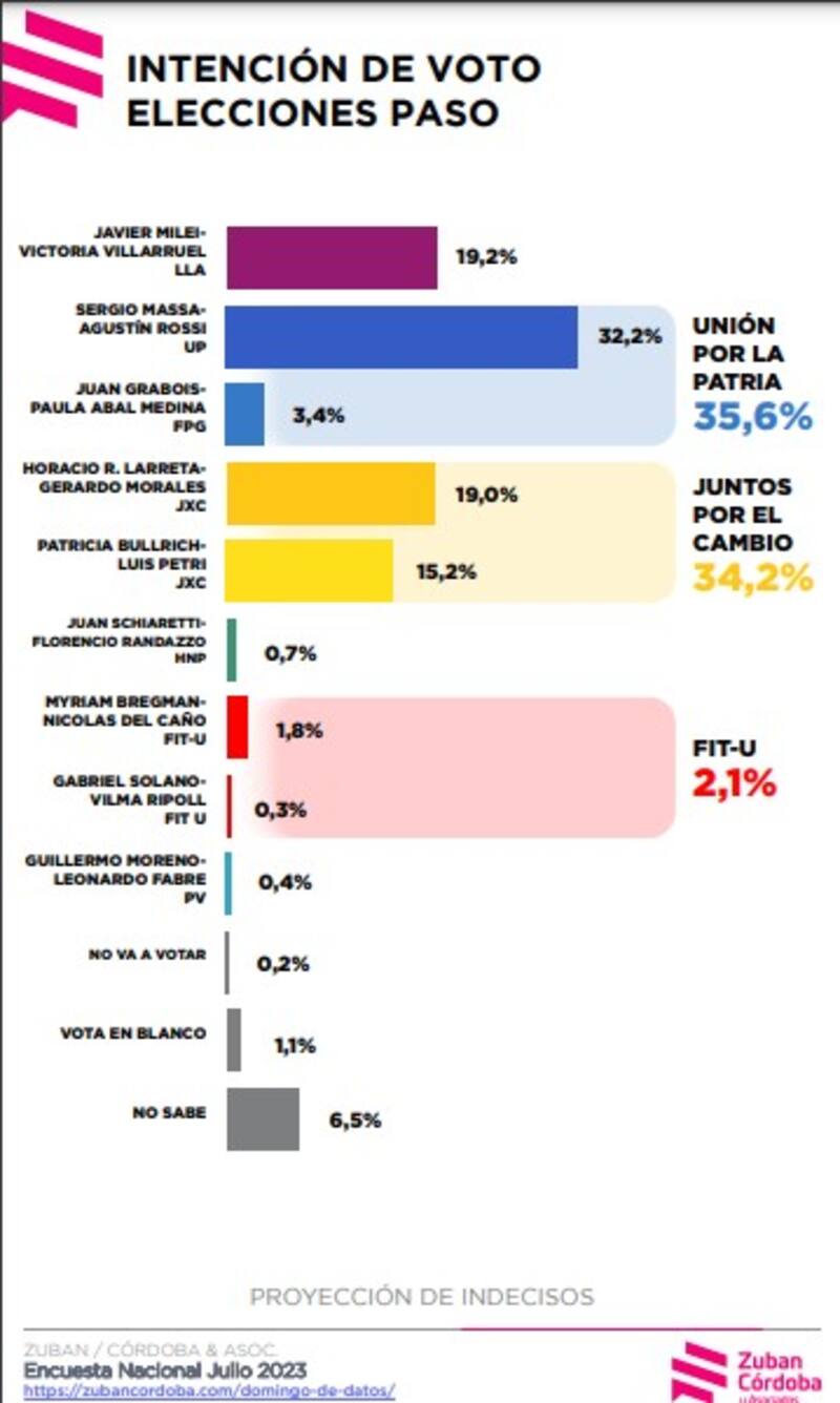 En síntesis: la sumatoria de Juntos por el Cambio obtiene un 29,7% de la intención de voto, seguida por Unión por la Patria con un 27,1% y la Libertad Avanza un 24,5%.