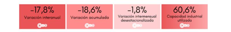 · Alimentos y bebidas: el sector registró una caída del 14,9% interanual en julio y del 2,6% respecto a junio. En los primeros siete meses acumula una baja del 17% interanual, operando con el 61,6% de su capacidad instalada.
