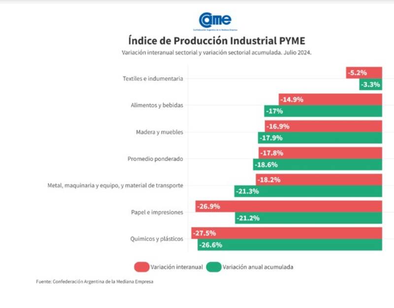 La producción manufacturera de las pequeñas y medianas empresas (pymes) sufrió una contracción del 17,8% en julio en comparación con el mismo mes del año anterior, según un relevamiento de la Confederación Argentina de la Mediana Empresa (CAME). Con este resultado, el sector acumula una baja del 18,6% en los primeros siete meses de 2024 frente al mismo período de 2023.