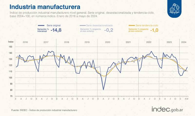 Según los datos oficiales, la producción industrial manufacturera cayó 14,8% interanual y frenó su recuperación respecto al mes anterior, mostrando una variación negativa del 0,2%.