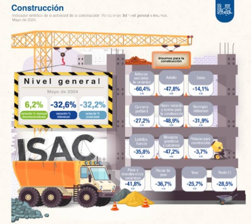 Los datos del consumo aparente de los insumos para la construcción en mayo de 2024 muestran, con relación a igual mes del año anterior, bajas de 60,4% en artículos sanitarios de cerámica; 48,9% en hierro redondo y aceros para la construcción; 47,8% en asfalto; 47,2% en mosaicos graníticos y calcáreos; y de 41,8% en pisos y revestimientos cerámicos.