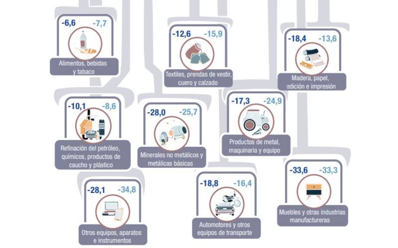 Se registraron disminuciones en "Industrias metálicas básicas", 25,0%; "Alimentos y bebidas", 6,4%; "Productos minerales no metálicos", 32,4%; "Madera, papel, edición e impresión", 18,4%; "Maquinaria y equipo", 22,0%; "Muebles y colchones, y otras industrias manufactureras", 33,6%; "Productos de caucho y plástico", 25,8%; "Sustancias y productos químicos", 8,3%; y "Otros equipos, aparatos e instrumentos", 28,1%.