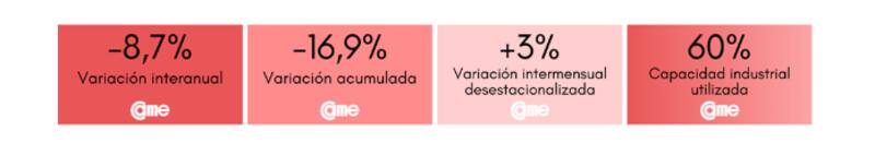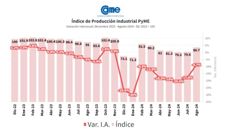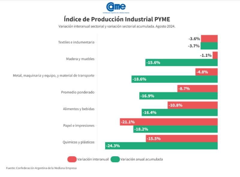 Estos datos provienen del Índice de Producción Industrial Pyme (IPIP) elaborado por la Confederación Argentina de la Mediana Empresa (CAME), basado en una muestra de 414 industrias a nivel federal. Los seis sectores manufactureros relevados registraron caídas interanuales, siendo "Papel e Impresiones" el más afectado, con una baja del 21,1%, seguido por "Químicos y Plásticos" con una contracción del 15,5%. En el extremo opuesto, "Maderas y Muebles" tuvo el menor descenso, con un 1,1%.