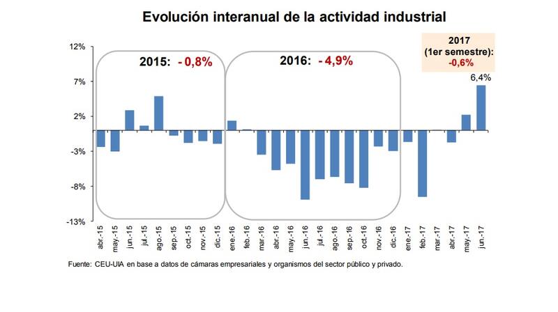 La producción industrial registró en junio un incremento interanual del 6,4% y permitió que el semestre cerrara con una caída acumulada del 0,6%, en tanto que las exportaciones de manufacturas crecieron en la primera mitad del año 7,8%, tras cinco años consecutivos de retracción, de acuerdo al relevamiento mensual que realiza el Centro de Estudios de la Unión Industrial Argentina.