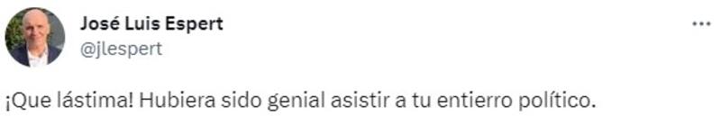 Mientras tanto, el precandidato a presidente en Juntos por el Cambio, José Luis Espert, al enterarse de la noticia apuntó de forma sarcástica contra Cristina Kirchner: "¡Que lástima! Hubiera sido genial asistir a tu entierro político".