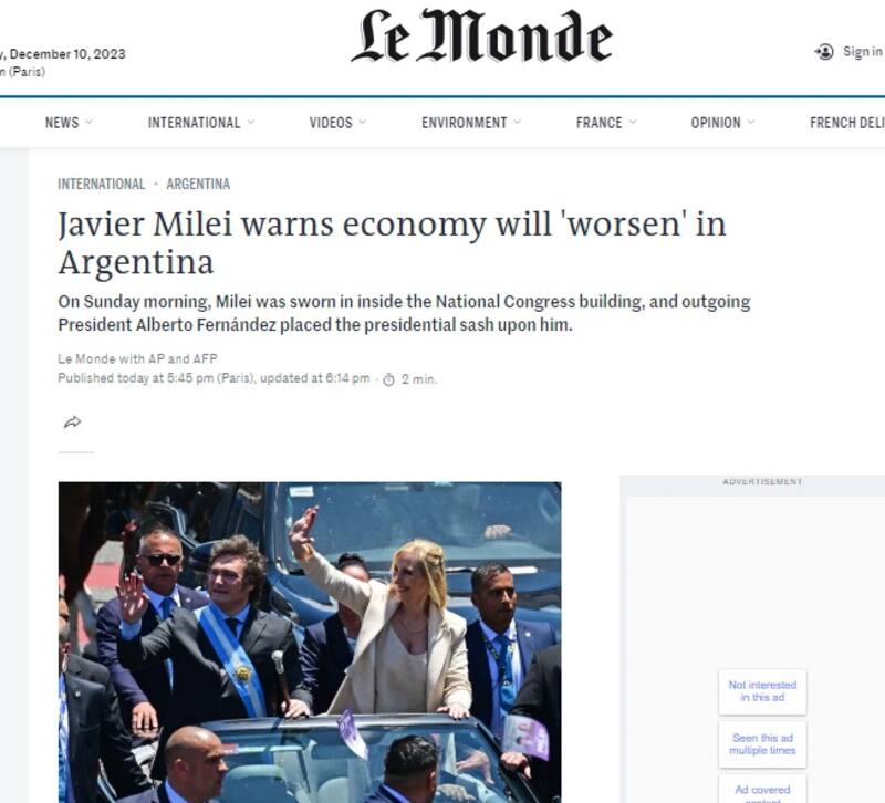 Bajo el titular "Javier Milei advierte que la economía 'empeorará' en Argentina", narran "las dolorosas medidas" que tomaría el presidente, aunque sostienen que sus predecesores le dejaron "la peor herencia" por "gastar excesivamente".