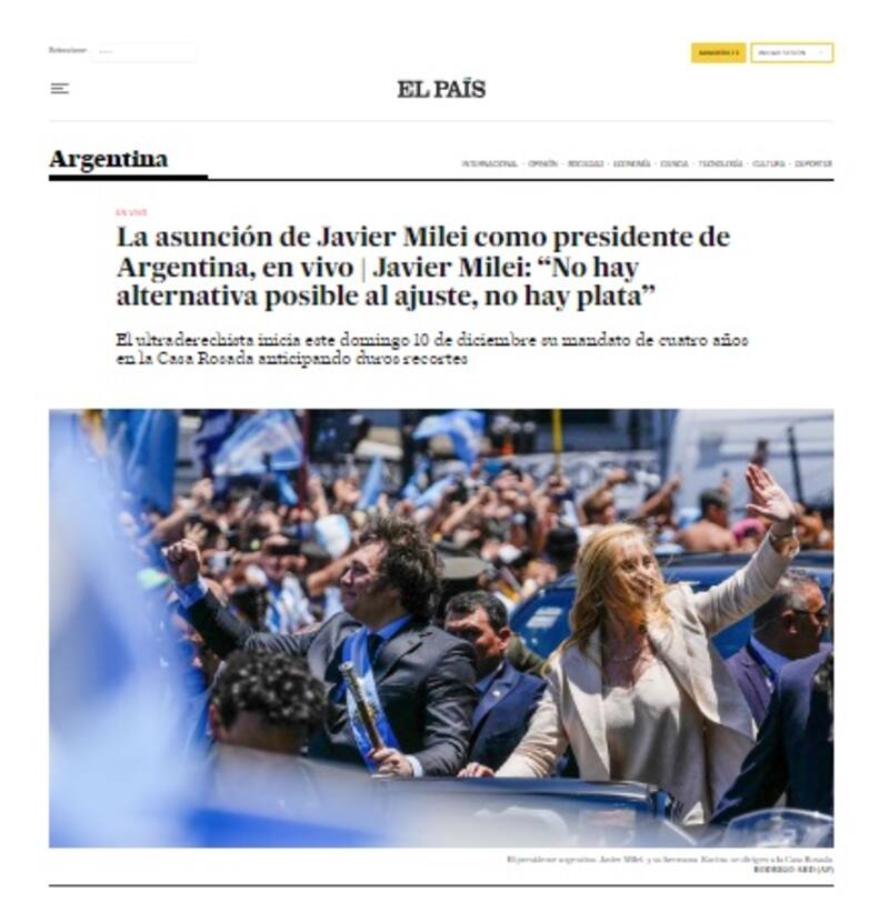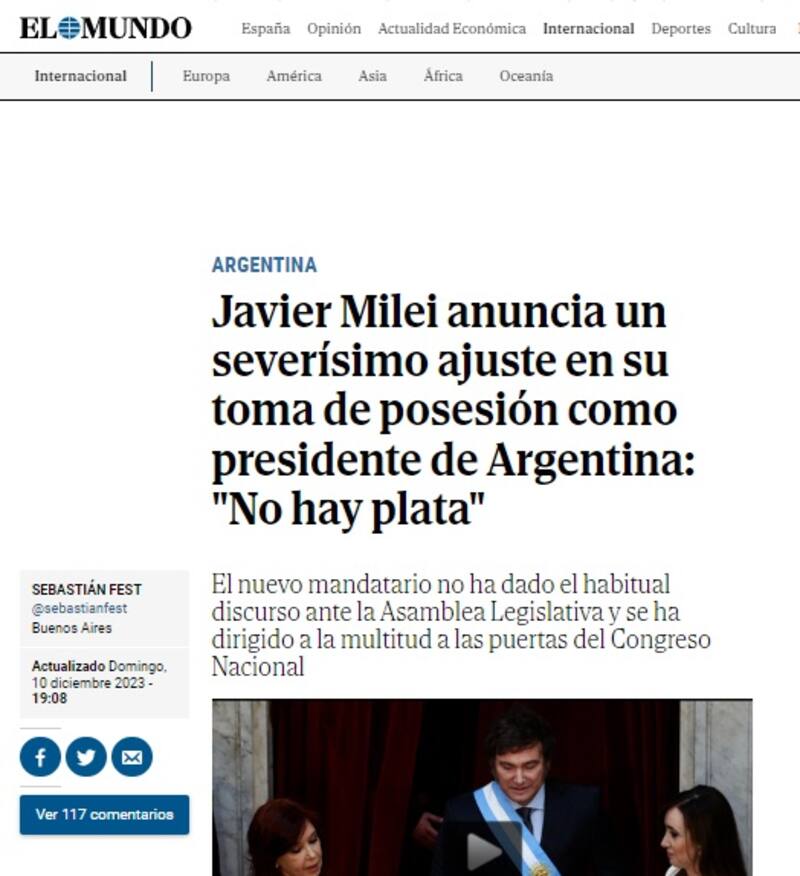 "Javier Milei anuncia un severísimo ajuste en su toma de posesión como presidente de Argentina: 'No hay plata'", titulo el diario El Mundo, al narrar el acto que se llevó adelante en el interior y en las afueras del Congreso.