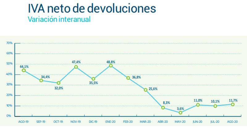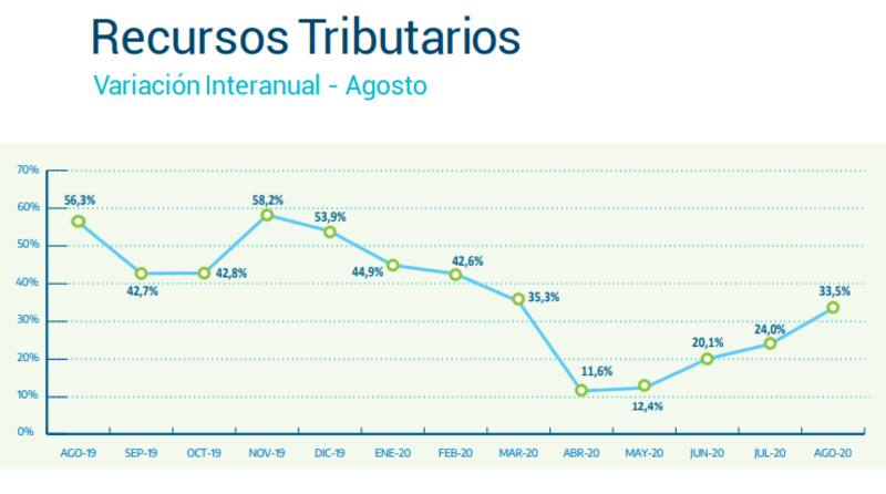 En julio, la recaudación había trepado un 24% y en junio, un 20,1%, mientras que en abril y en mayo el efecto de la parálisis económica se había sentido con más fuerza, con variaciones de apenas 11,6% y 12,4%, respectivamente.