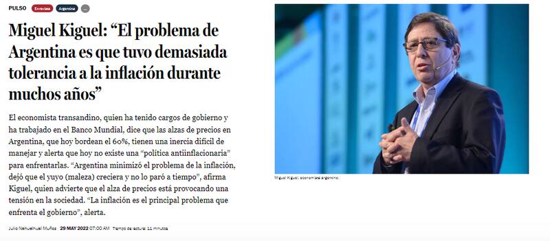 En otro tramo, el exfuncionario y quien también ocupó cargos en el Banco Mundial (BM), advirtió que durante los 20 años, no existió en Argentina "una política inflacionaria seria", donde se acentúen los esfuerzos en el despliegue de una "política monetaria, una cierta política fiscal y un conjunto de medidas que apunten a anclar expectativas".