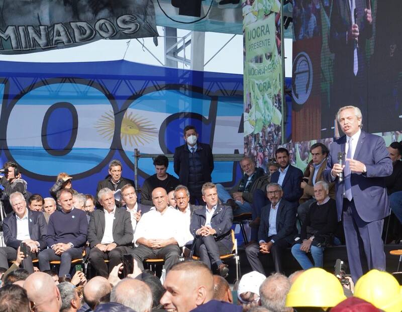 En Echeverría, acto que organizó Gerardo Martínez para mostrar respaldo al Presidente, hubo presencia de gran parte de los ministros aunque no todos (faltó con aviso Eduardo ‘Wado' de Pedro, entre otros) aunque se destacó la participación de Scioli junto al jefe de gabinete Juan Manzur. También tuvo centralidad el Movimiento Evita que lideran Emilio Pérsico y Fernando Navarro con planes para competir contra Espinoza en La Matanza nada menos que posicionando como precandidata a Patricia Cubría, mujer de Pérsico.