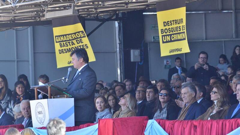 Con la insignia “Destruir bosques es un crimen , uno de los mensajes se desplego arriba del mandatario, quien estaba sentado en primera fila, escuchando el discurso del titular de la Sociedad Rural Argentina, Daniel Pelegrina. La intervención fue sincronizada de tal manera que los carteles se desplegaron justo en el momento en el que los fotógrafos tuvieron acceso al campo, para tomar imágenes de Macri y Pelegrina. Al instante, quienes estaban en el palco presidencial arrancaron los carteles.