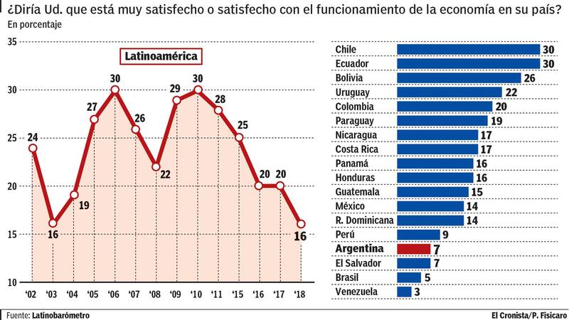 El caso argentino es uno de los más preocupantes, ya que quienes están satisfechos con la economía alcanzan solamente el 7% de las respuestas. Solo Brasil con el 5% y Venezuela con el 3% tienen números más bajos. Chile y Ecuador se encuentran en el otro extremo, con el 30% de satisfechos. Respondieron el relevamiento 20.000 ciudadanos de 18 países de la región.