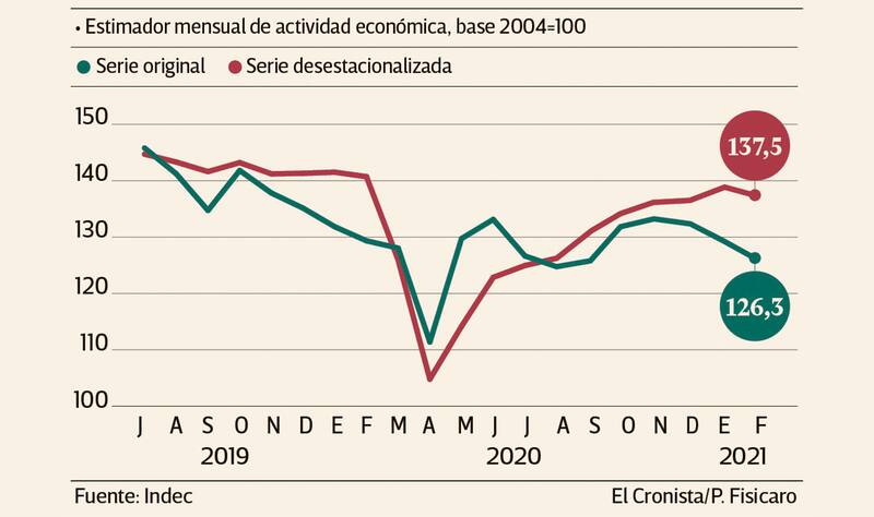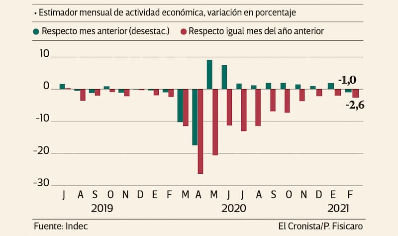 En febrero, el Estimador Mensual de Actividad Económica (EMAE) del Indec cortó una racha de nueve subas mensuales al hilo y cayó 1% en la comparación desestacionalizada contra enero, mientras se mantiene 2,6% por debajo del mismo mes de 2020. Las estimaciones de relevamientos privados anticipan que en marzo volvería a crecer, pero en abril retornaría la caída.