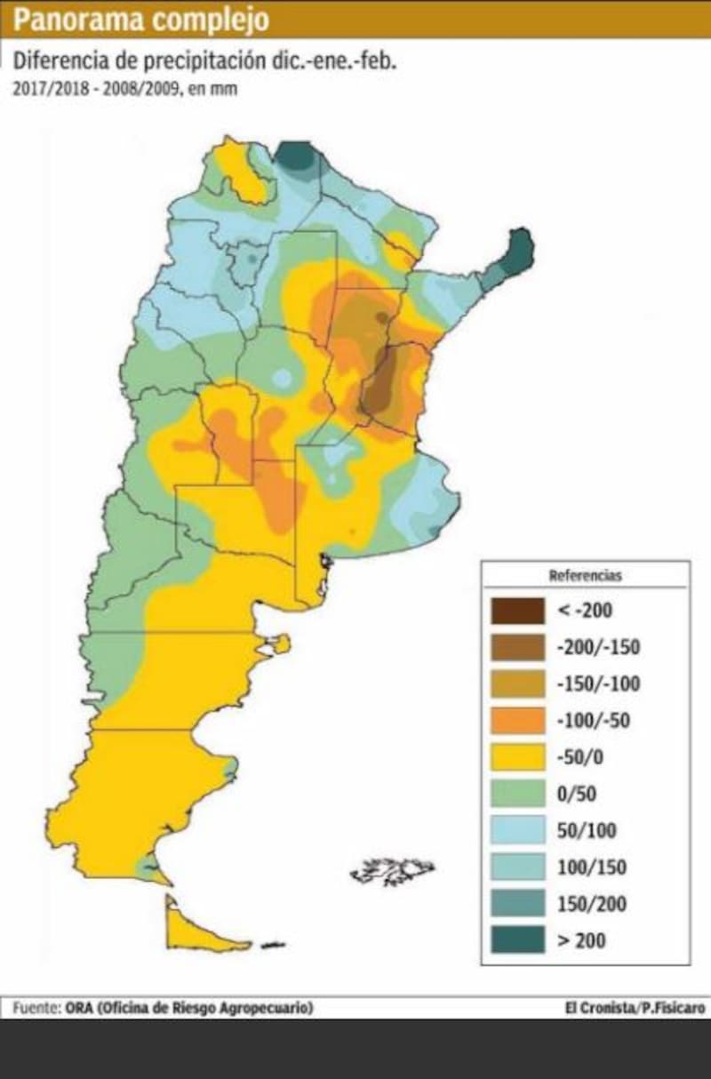 Resaltaron que, como consta en los registros del Servicio Meteorológico Nacional, las lluvias del trimestre noviembre-enero fueron de entre 100 y hasta 300 milímetros por debajo de lo normal. Y que el impacto productivo de la sequía fue atenuado, al menos en algunas situaciones, "por la alta reserva de agua de los suelos y la presencia de napa freática por las altas lluvias de 2017.