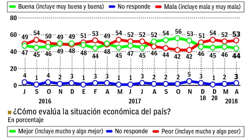 El resultado encuentra un motivo en la mirada sobre el andar de la economía. En abril, un 64% de los consultados evaluó que la situación actual es peor que la de hace un año, mientras que apenas un 34% cree que está mejor, el peor registro en los últimos 18 meses. La perspectiva sobre el futuro tampoco es alentadora, ya un 52% de los encuestados cree que la economía doméstica estará más deteriorada dentro de un año, el dato más bajo desde que empezó a realizarse el monitor, en julio de 2016. A la hora de relevar las mayores preocupaciones, la inflación fue elegida por nueve de cada diez personas, número que crece mes a mes desde noviembre pasado. En tanto, el incremento en las tarifas de luz y gas (69%) superó a la inseguridad (66%), la presión impositiva (61%) y otros aumentos (53%). Otra preocupación en alza es la posible corrupción del gobierno actual (46%) y que no se castigue la del gobierno anterior (40%). "A pesar de que la imagen de los principales dirigentes de Cambiemos se mantiene estable (Macri, Vidal, Carrió), en los datos del mes de abril se observa una creciente opinión crítica del núcleo duro de votantes de la coalición oficialista respecto de la gestión del gobierno. En particular, la inflación se afirma como la primera preocupación, seguida por los aumentos en las tarifas de los servicios públicos", advirtió, en esa línea, Sergio Berensztein.
