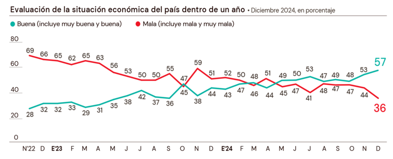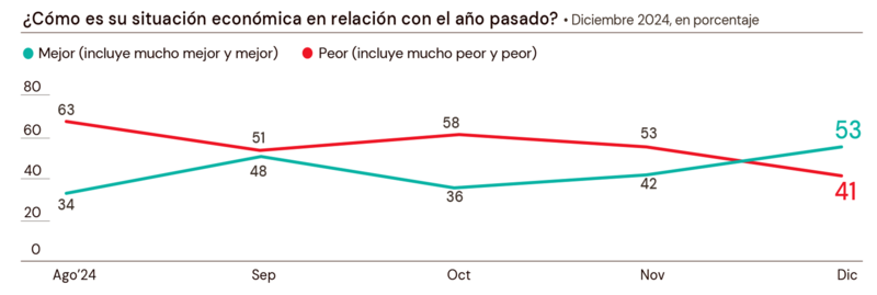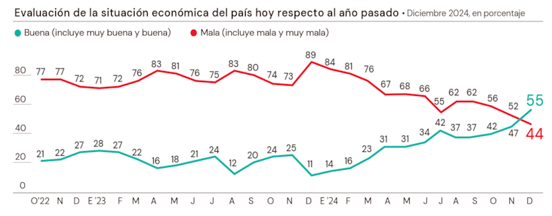 En este escenario, la visión sobre la actual situación económica del país alcanzó un pico de 55%, frente al piso de 11%que mostraba en diciembre del 2023 y al 47% de noviembre último.