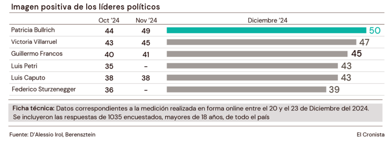 La lista de dirigentes con mejor imagen la encabeza la ministra de Seguridad, Patricia Bullrich, con 50% de positiva y 45% de negativa; seguida por Milei (48% y 47%, respectivamente) y la vicepresidenta Victoria Villarruel (47% y 45%).