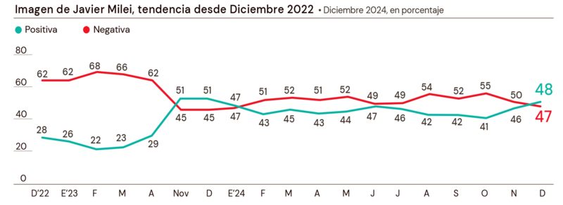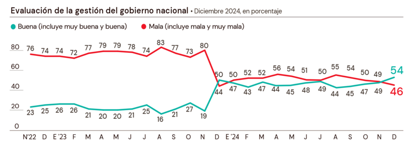 "Estos elementos justifican la buena calificación del Gobierno. Los valores positivos pasaron del 44% en agosto al 54% en diciembre, reflejando un desplazamiento de opositores hacia una valoración más favorable de la gestión", agregó, al indicar como "uno de los datos más relevantes" que el 18% de los opositores "comienza a inclinarse hacia una visión positiva de la gestión de Javier Milei".