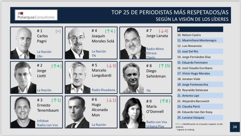 Por otro lado, la consultora Poliarquía llevó adelante su relevamiento sobre quién es el periodista más respetado entre los Líderes y Formadores de Opinión del País.