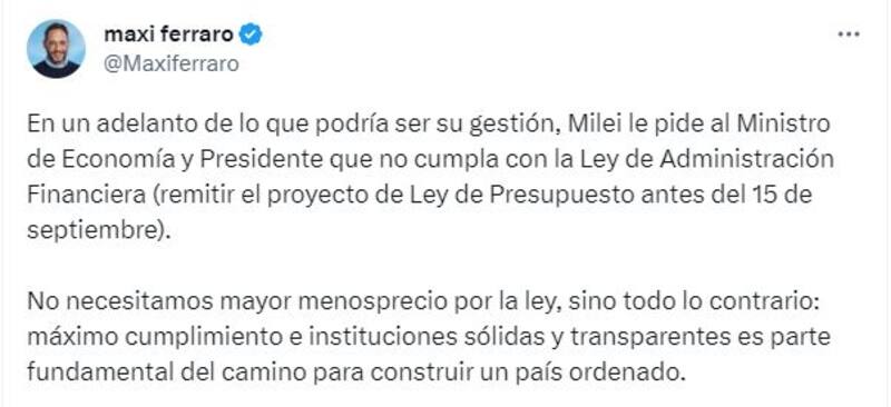 A los cuestionamientos se sumó el legislador y presidente de la Coalición Cívica, Maximiliano Ferraro. "En un adelanto de lo que podría ser su gestión, Milei le pide al ministro de Economía y presidente que no cumpla con la Ley de Administración Financiera (remitir el proyecto de Ley de Presupuesto antes del 15 de septiembre)".