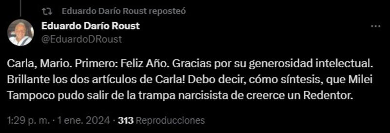 La concepción de Roust sobre el libertario no quedó de la mejor manera. En vísperas de Año Nuevo compartió por cadena de WhatsApp un artículo de El País titulado Libertad sin derechos: la utopía libertaria de Milei. Esta nota le gustó tanto que felicitó a su autora, Carla Yumatle, en redes, comentándole que Milei no "pudo salir de la trampa narcisista de creerse un Redentor".