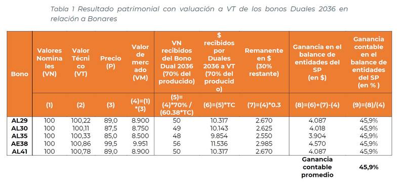 "La ganancia patrimonial es de casi +46% producto de la venta y posterior suscripción del bono dual 2036 por el 70% del producido. Complementariamente, los organismos reciben el 30% restante en efectivo", señala al respecto.