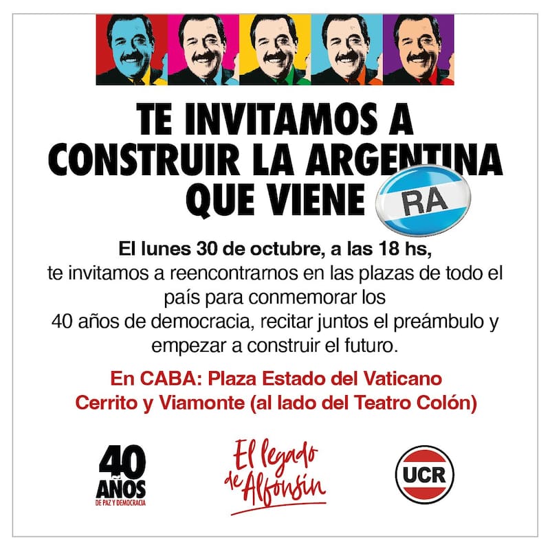 El partido que preside Gerardo Morales celebrará este lunes un nuevo aniversario de las elecciones que dieron como ganador a Alfonsín. La cita es a las 18.30 en la Plaza Estado del Vaticano, situada en el cruce de las calles Cerrito y Viamonte, a un lado del Teatro Colón, en el centro porteño.