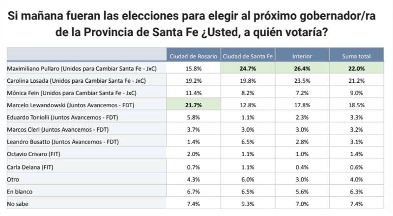 Según el relevo, Losada es la favorita de JxC en la Ciudad de Rosario (19,2%) -distrito en el que el más votado sería el oficialista Marcelo Lewandowski (21,7%), mientras que en la Ciudad de Santa Fe (24,7%) y el interior de la provincia (26,4%) quien se presagia como claro ganador es Pullaro.