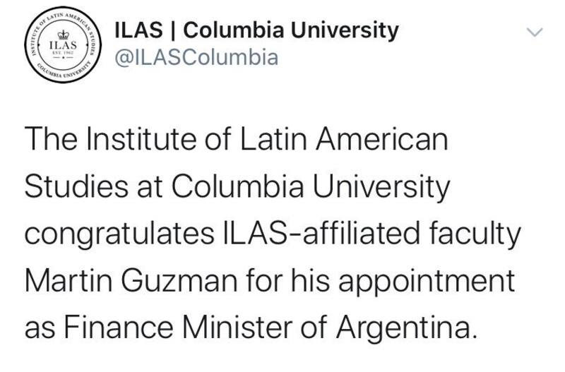 "El Instituto de Estudios Latinoamericanos de la Universidad de Columbia felicita al afiliado al ILAS Martin Guzmán por su nombramiento como Ministro de Finanzas de Argentina", publicó en su cuenta de Twitter