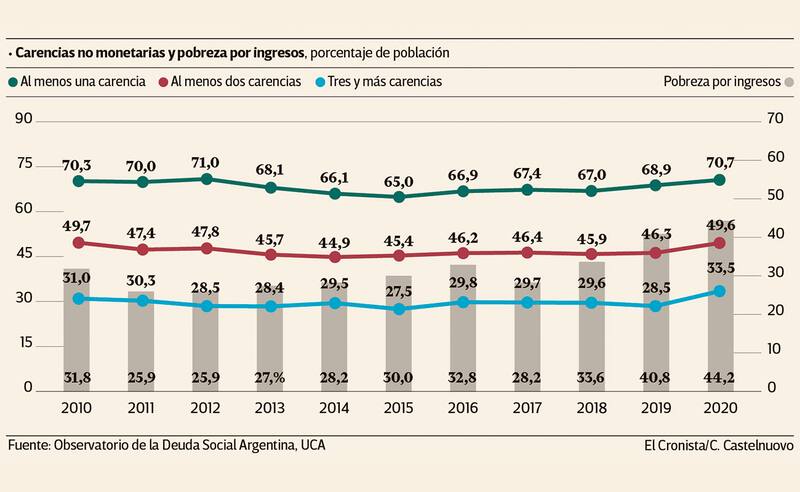 A la vez, el documento reveló que la pobreza por ingresos pasó del 40,8% en 2019 al 44,2% en 2020. Aunque las personas que percibieron al menos una carencia fue del orden del 70,7% el último año.