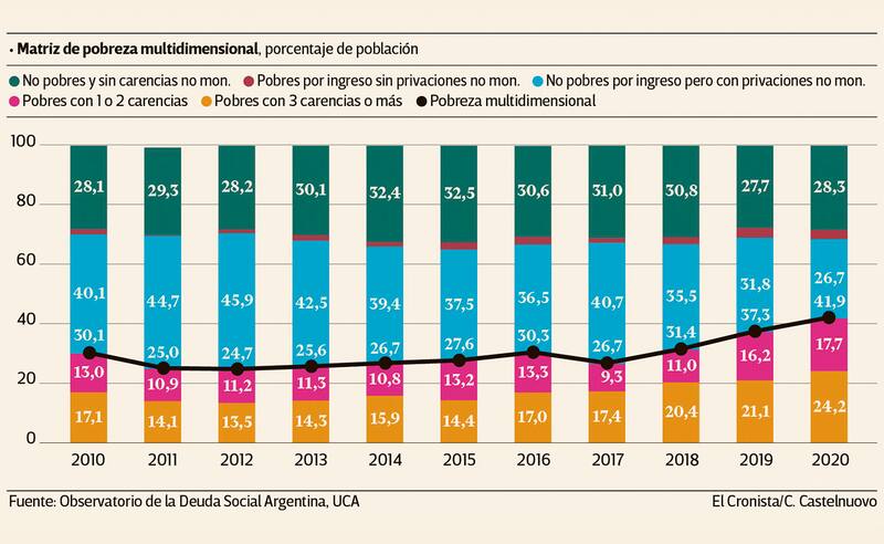 La matriz de la pobreza multidimensional, es decir aquella que no sólo mide la caída de los ingresos de una persona sino la falta de otros factores como una vivienda digna, alimentación, salud, educación o servicios esenciales, mostró un mapa de la Argentina realmente alarmante. Mientras que en 2019 el promedio de gente con pobreza multidimensional era el 37,3% en 2020 pasó al 41,9%.