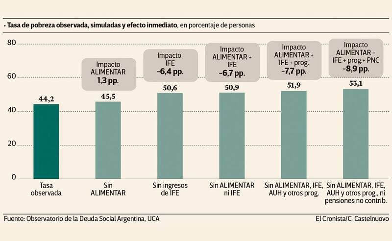 En el informe se describe también que sin la ayuda estatal del IFE, la AUH, la Tarjeta Alimentar y otros programas sociales que se potenciaron durante la pandemia los niveles de pobreza en la Argentina hubieran llegado al 53,1% . Lejos del 44,2% observado por el Observatorio de la Deuda Social de la UCA.