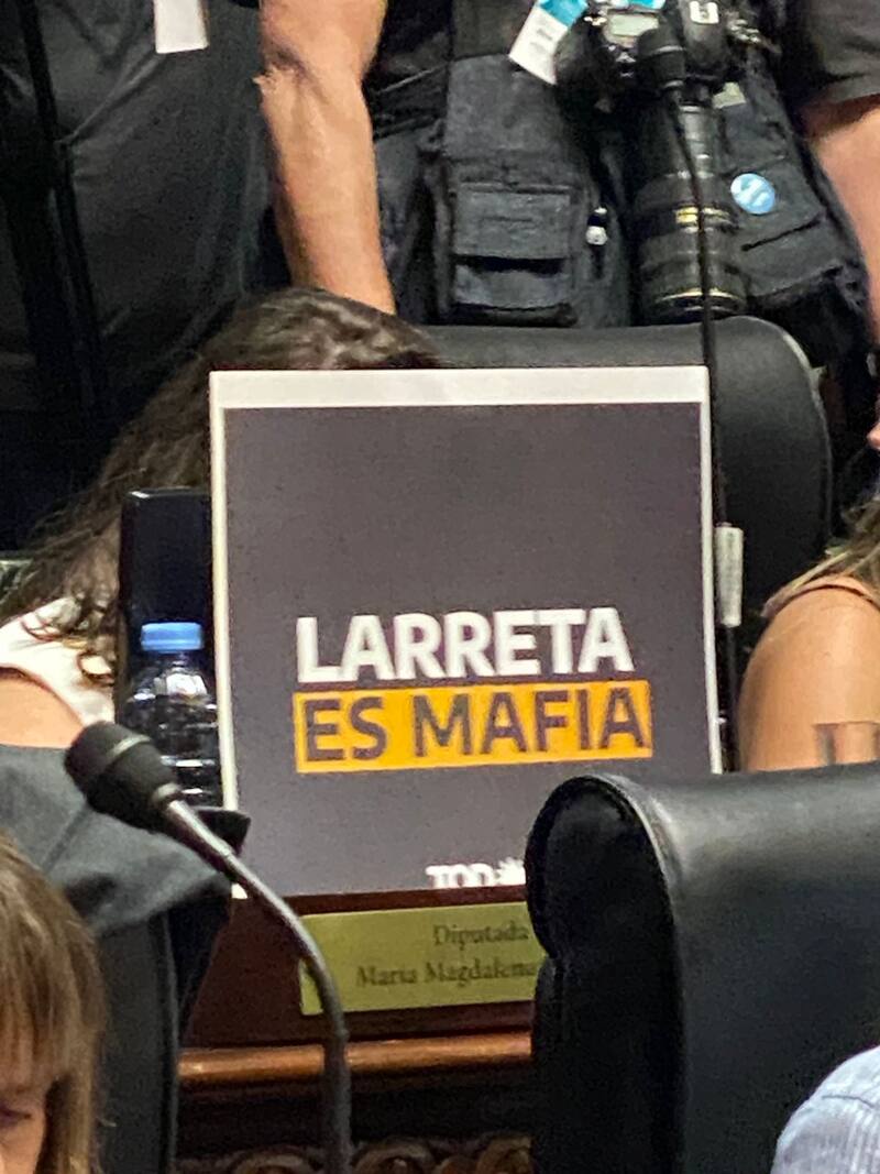 El Frente de Todos Porteño recibió al Jefe de Gobierno de la Ciudad, Horacio Rodríguez Larreta, con cartelería crítica a su gestión: "Larreta es Mafia", en la Apertura de Sesiones Ordinarias en la Legislatura Porteña.